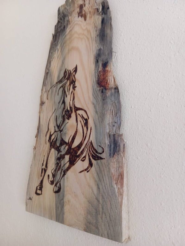 Pirografiado de caballo corriendo en madera rústica de pino.