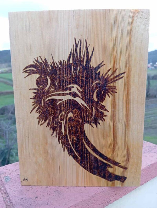 Pirograbado en madera de pino, en forma de taco pesado para estantería, sin necesidad de colgarlo de la pared.
