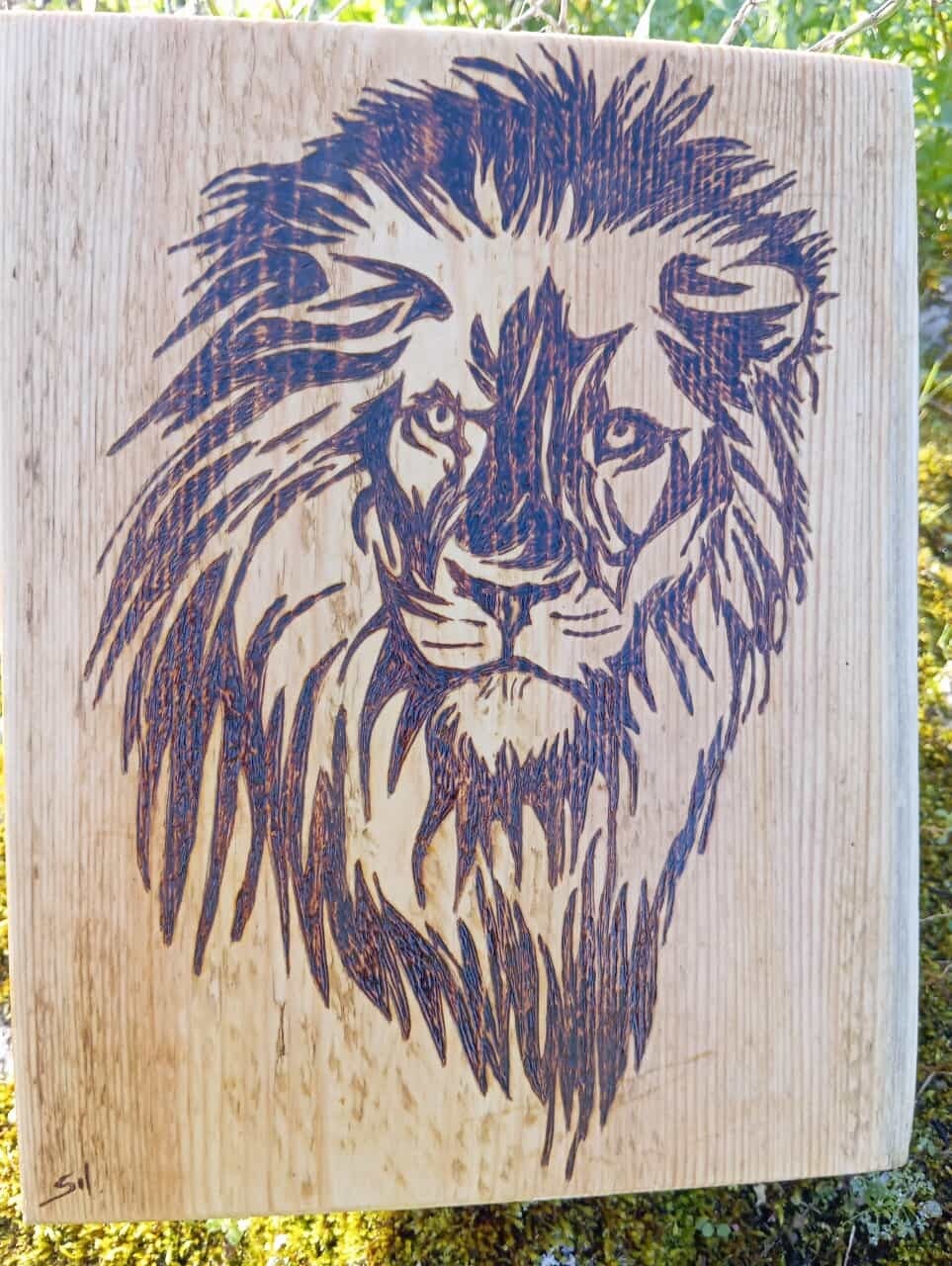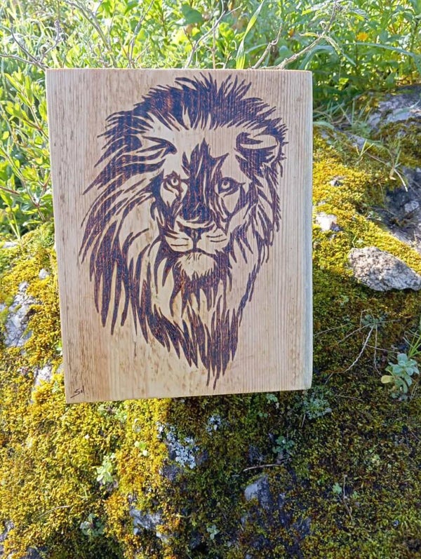 Pirograbado en taco de madera de pino. Cuadro que se sostiene solo en una estantería