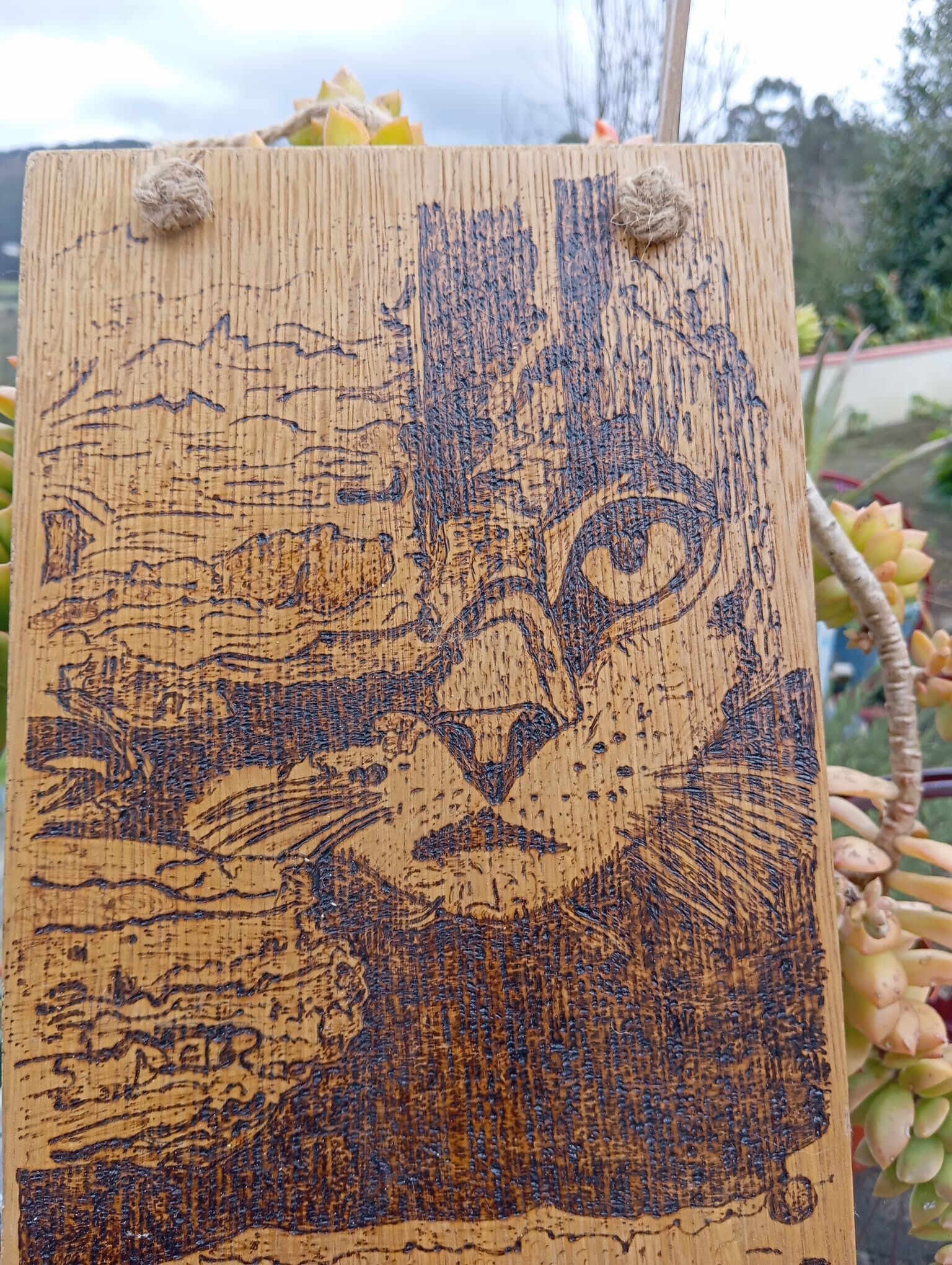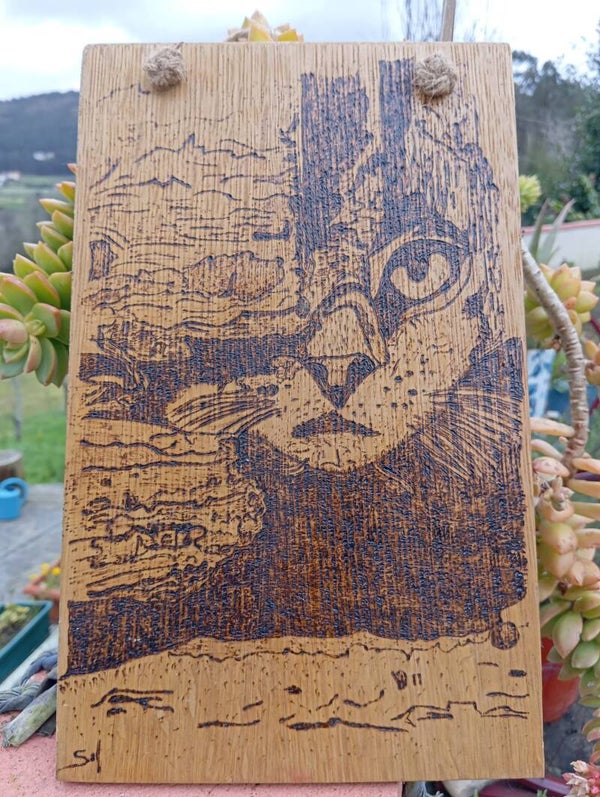 Pirograbado en madera de contrachapado, con cuerda de cáñamo con nudos decorativos para colgar de la pared.