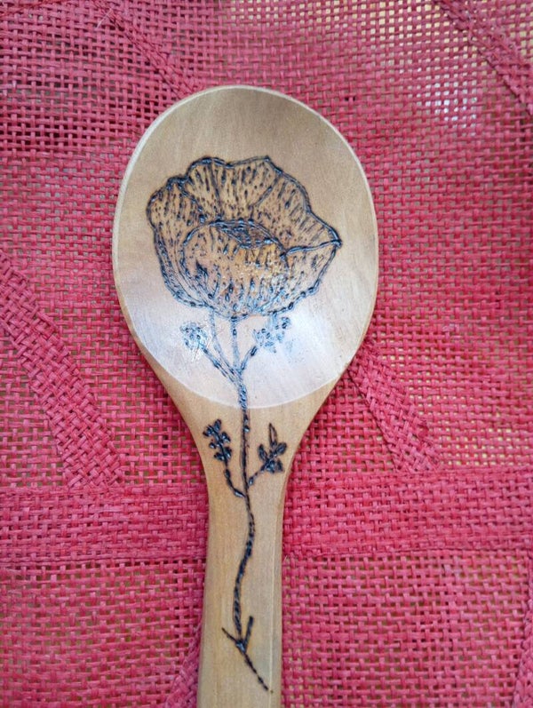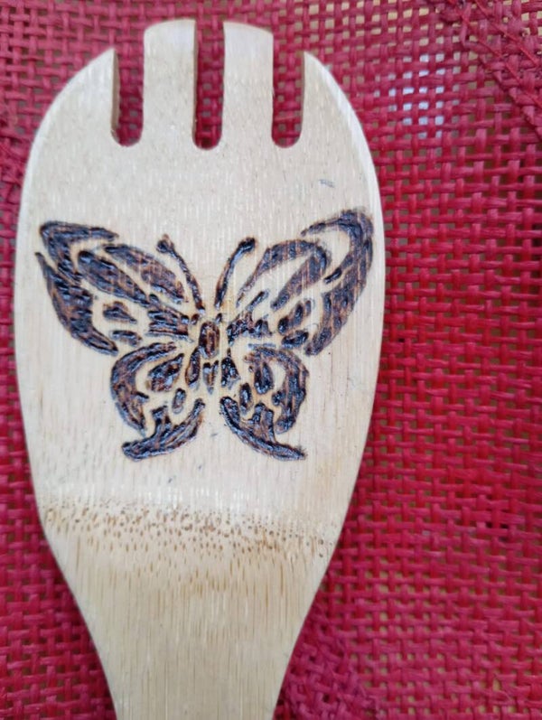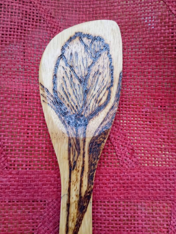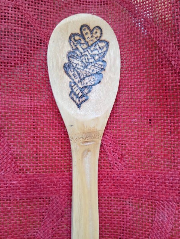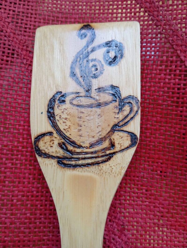 Cucharas, tenedorred, espátulas de madera pirografiados en diferentes estilos.